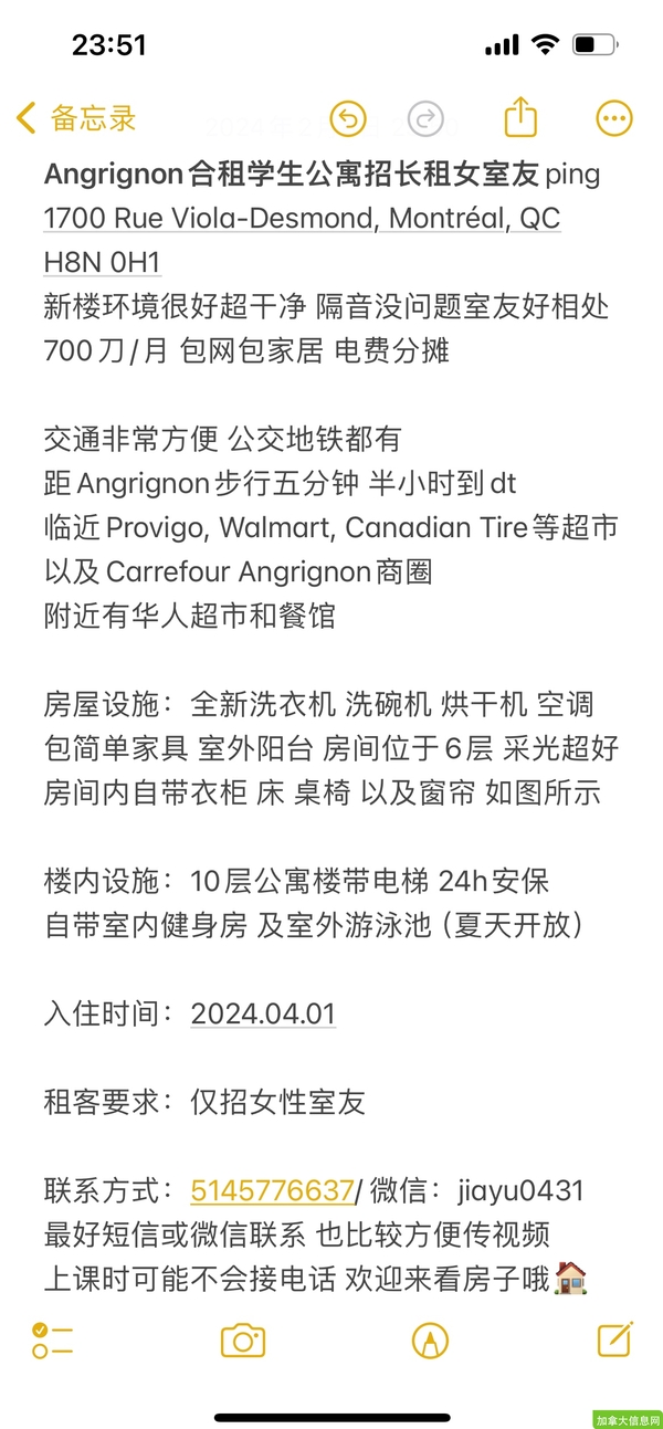Angrignon合租学生公寓招长租女室友ping