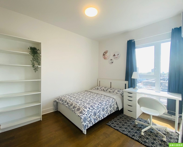 每个卧室都配置Full size 双人床、书桌书架及入墙式衣橱(或衣帽间)