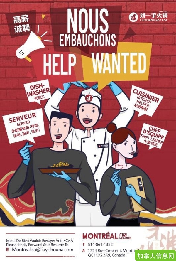 刘一手蒙特利尔招聘啦!我们刘一手团队热诚地邀请勤快、踏实、高效、沟通好、追求快乐、富有团队精神的您加入我们。