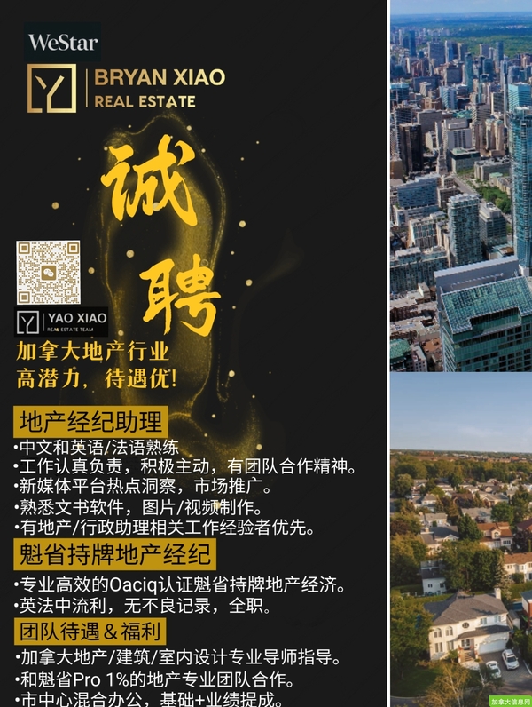 因业务繁忙,YAO XIAO Real Estate Team诚聘魁省地区地产经纪行政助理和全职专业持牌地产经纪人。