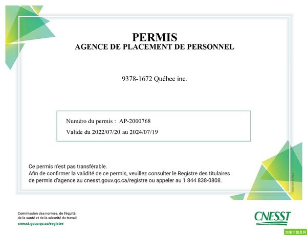 我们是蒙特利尔的康狮人力资源公司 (Constantochoix Ressource)。执照号:AP-2000768。我们将竭诚为您服务!