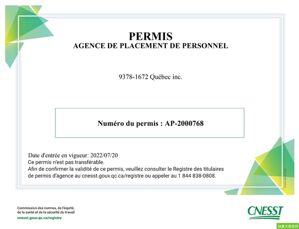 我们是蒙特利尔的康狮人力资源公司 (Constantochoix Ressource)。执照号:AP-2000768。我们将竭诚为您服务!