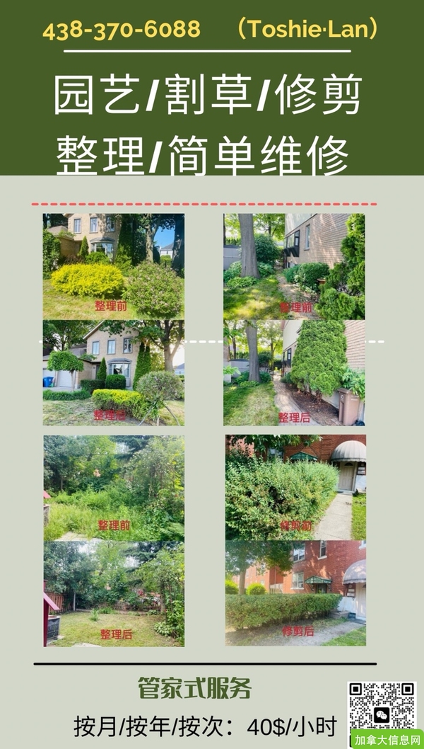 南岸大L区,急招有户外工作经验帮手一名;主要工作:拖车运土+移植花卉;30$/小时,工作时间9:00-18:00(预估,以实际为准),7月4日有效,联系电话438-3706088