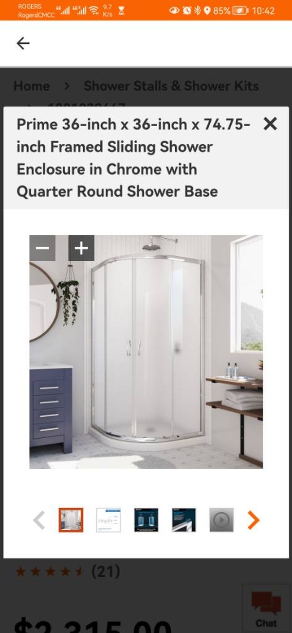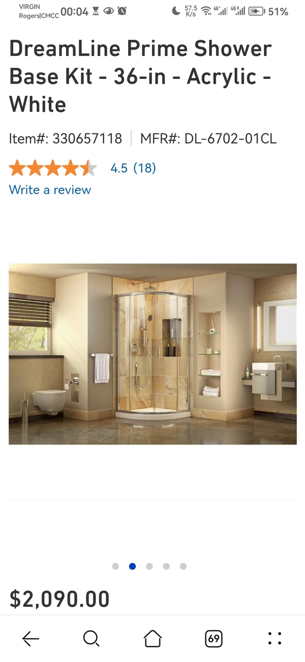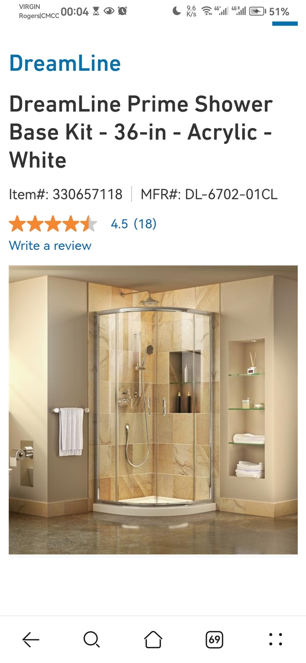 1/4 圓形全新(未使用、未安装)Dreamline淋浴房套件,Lowe's购买,因拆了包装不能退货,现低价出售。包括底座,玻璃门及全套安装配件,無墙面板。