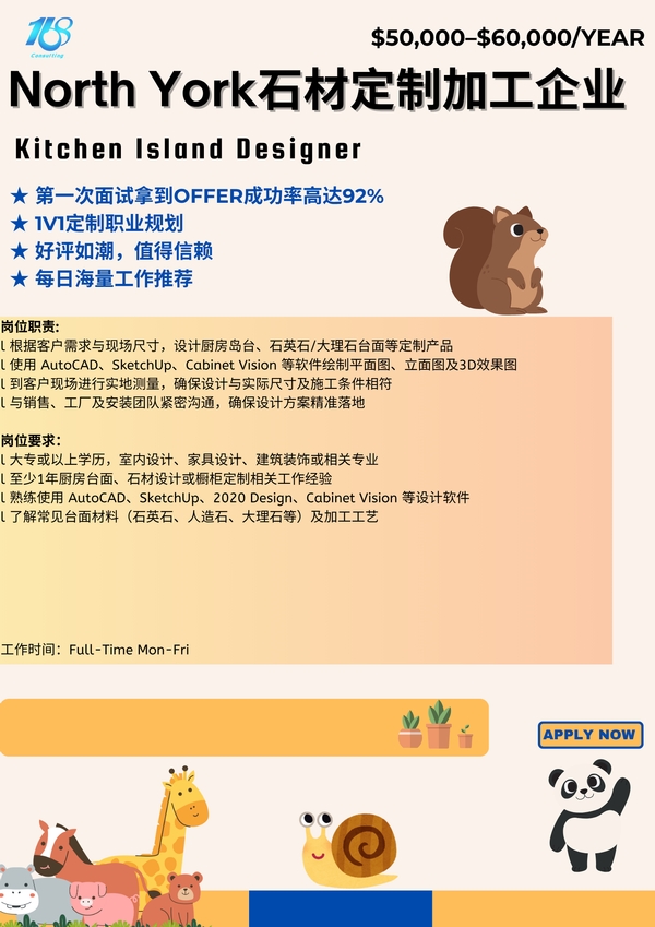 【168中介内推】North York石材定制加工企业诚聘Kitchen Island Designer