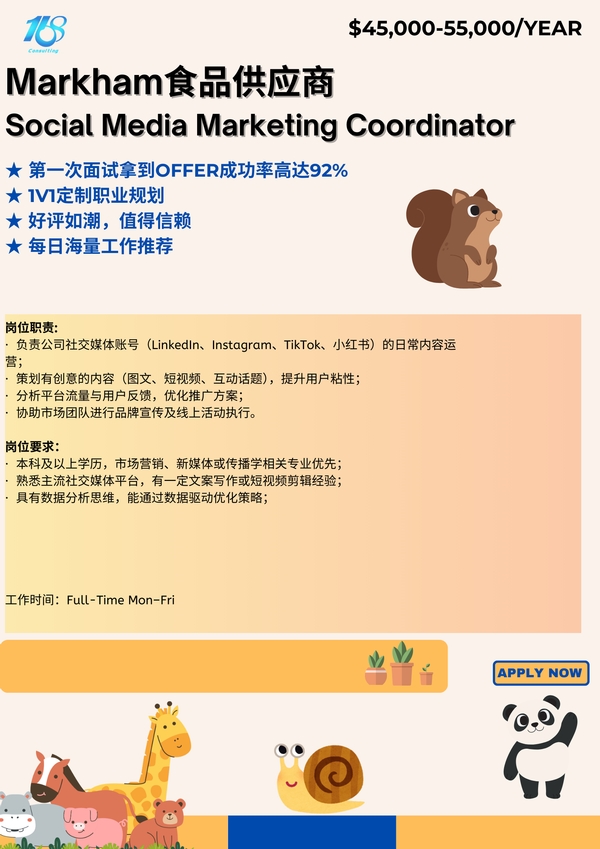【168中介内推】Markham食品供应商诚聘Social Media Marketing Coordinator