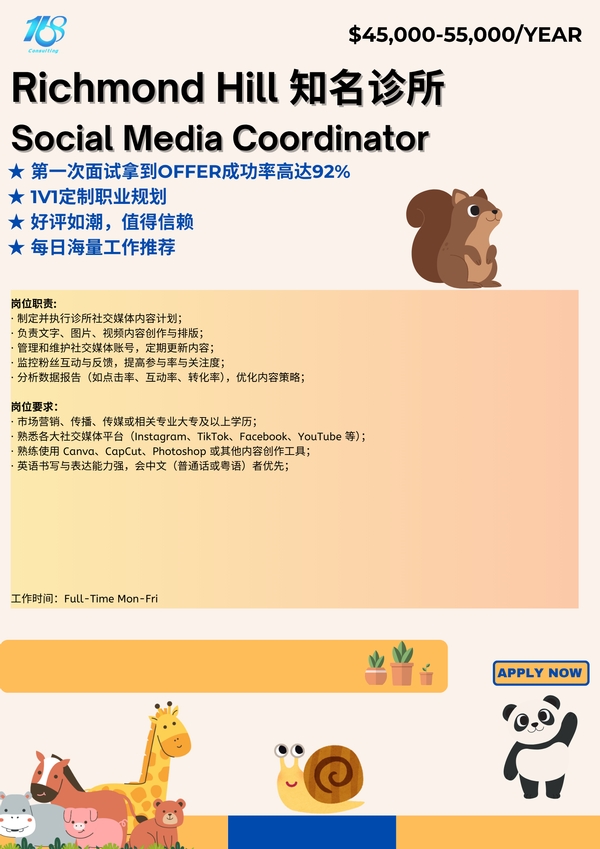 【168中介内推】Richmond Hill 知名诊所诚聘Social Media Coordinator