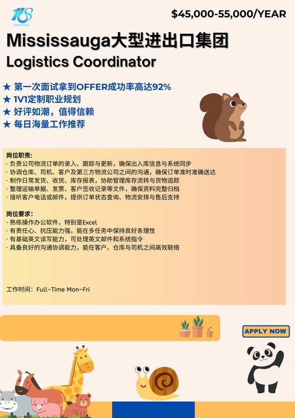 【168中介内推】Mississauga大型进出口集团诚招Logistics Coordinator
