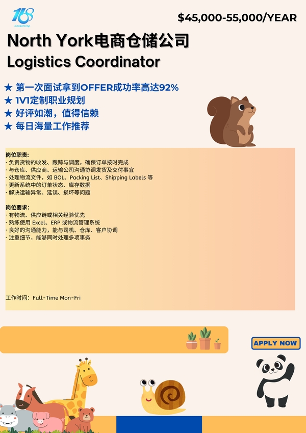 【168中介内推】North York电商仓储公司诚聘Logistics Coordinator