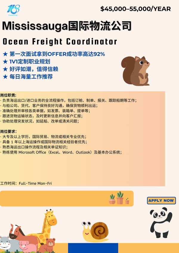 【168中介内推】Mississauga国际物流公司诚聘Ocean Freight Coordinator