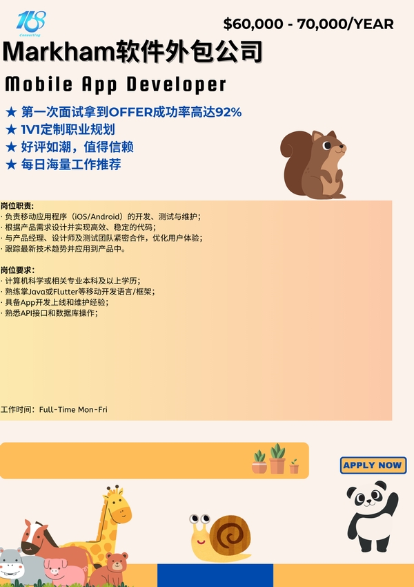 【168中介内推】Markham软件外包公司诚聘Mobile App Developer