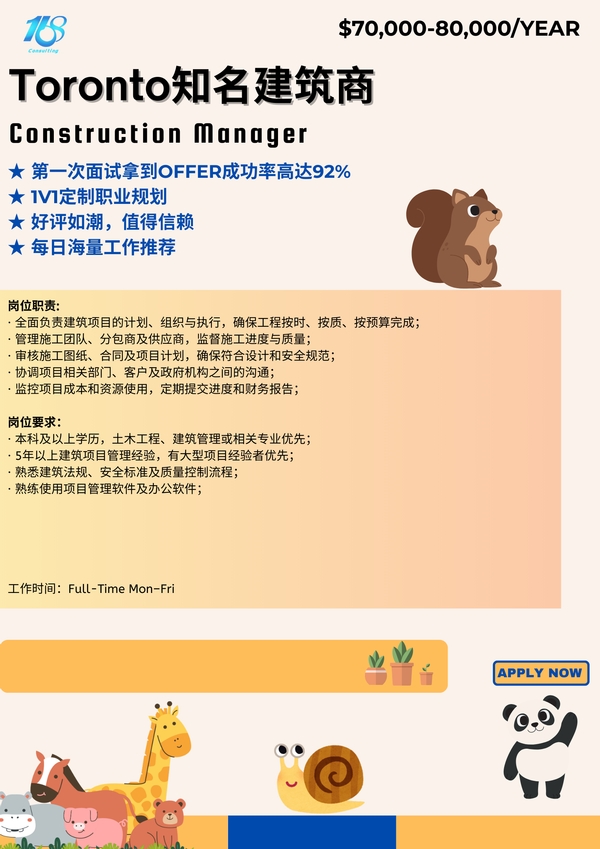 【168中介内推】Toronto知名建筑商诚聘Construction Manager