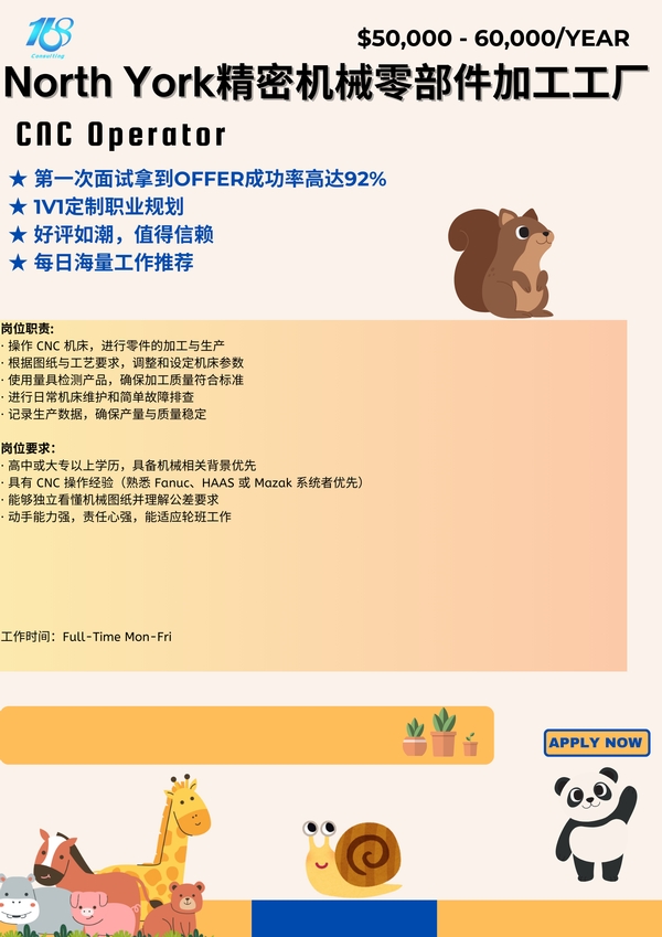 【168中介内推】Richmond Hill精密机械零部件加工工厂诚聘CNC Operator