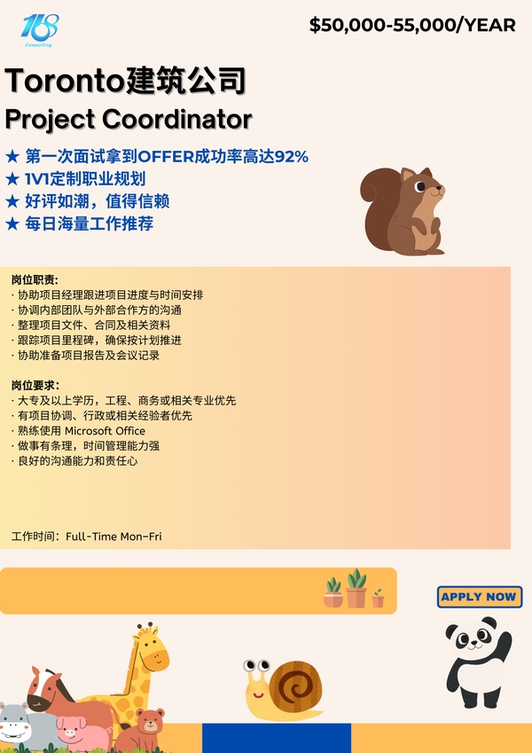 【168中介内推】Toronto建筑公司诚聘Project Coordinator
