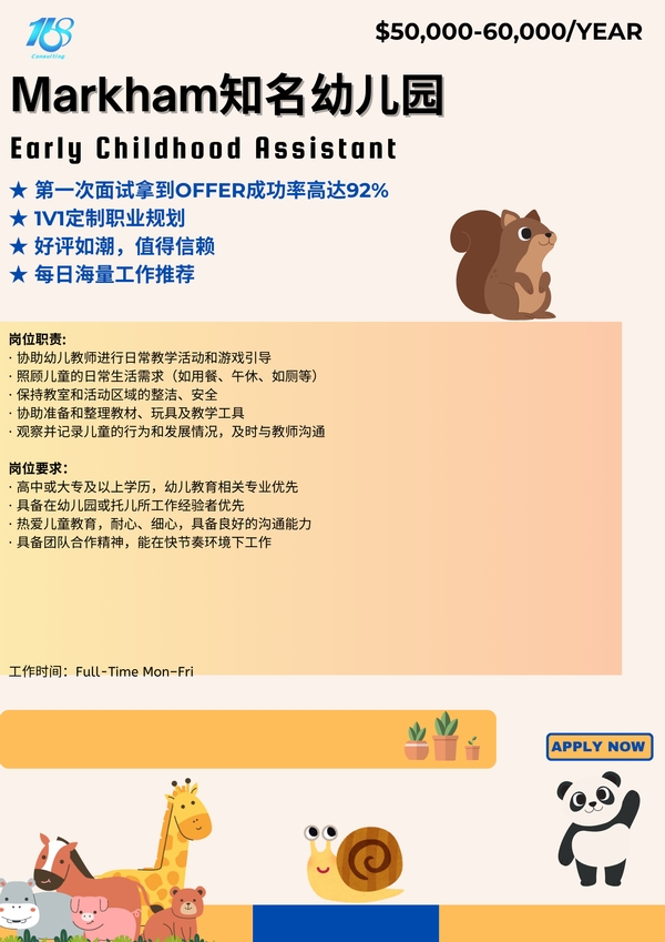 【168中介内推】Markham知名幼儿园诚聘Early Childhood Assistant