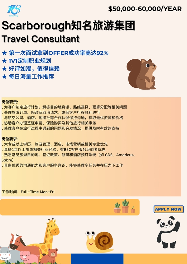 【168中介内推】Scarborough知名旅游集团诚聘Travel Consultant