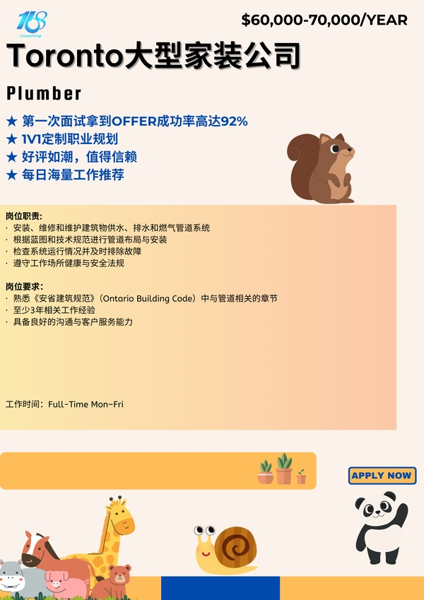 【168中介内推】Toronto大型家装公司诚聘Plumber