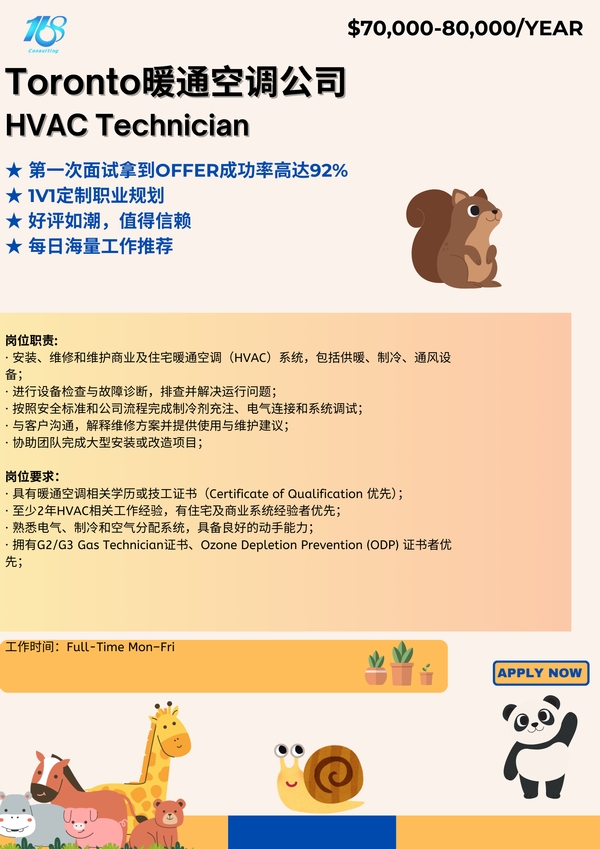 【168中介内推】Toronto暖通空调公司诚聘HVAC Technician