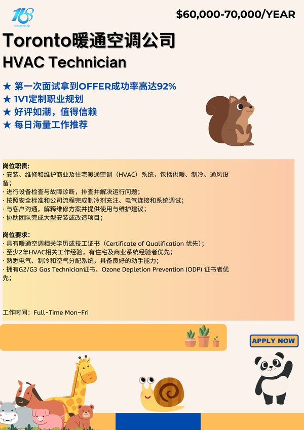 【168中介内推】Toronto暖通空调公司诚聘HVAC Technician