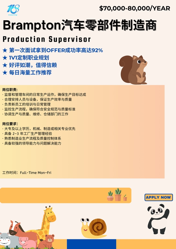 【168中介内推】Brampton汽车零部件制造商诚聘Production Supervisor