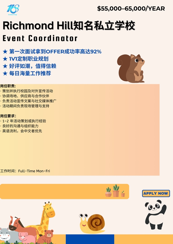 【168中介内推】Richmond Hill知名私立学校诚聘Event Coordinator