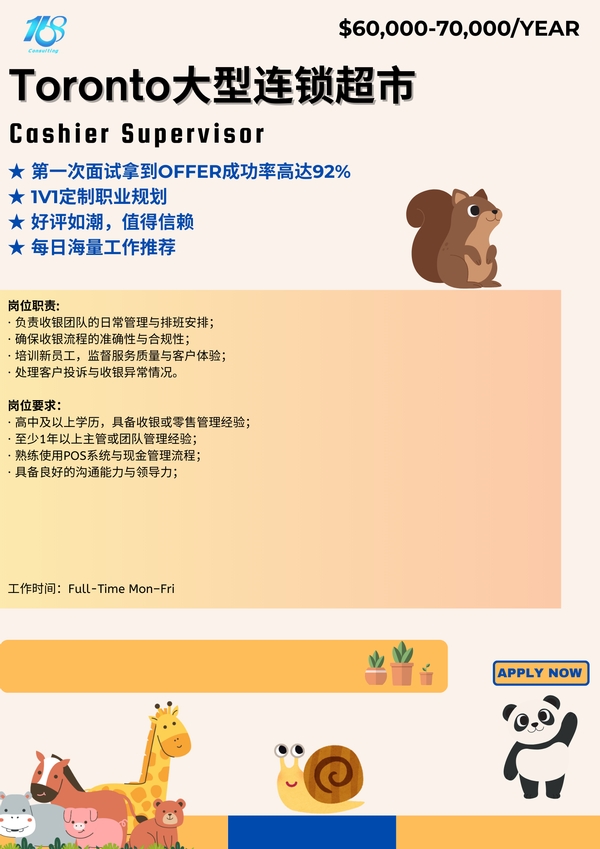 【168中介内推】Toronto大型连锁超市诚聘Cashier Supervisor