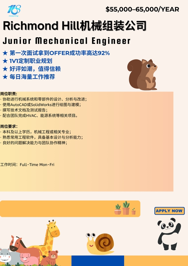 【168中介内推】Richmond Hill机械组装公司诚聘Junior Mechanical Engineer