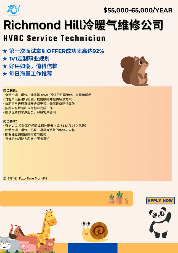 【168中介内推】Richmond Hill冷暖气维修公司诚聘HVAC Specialist
