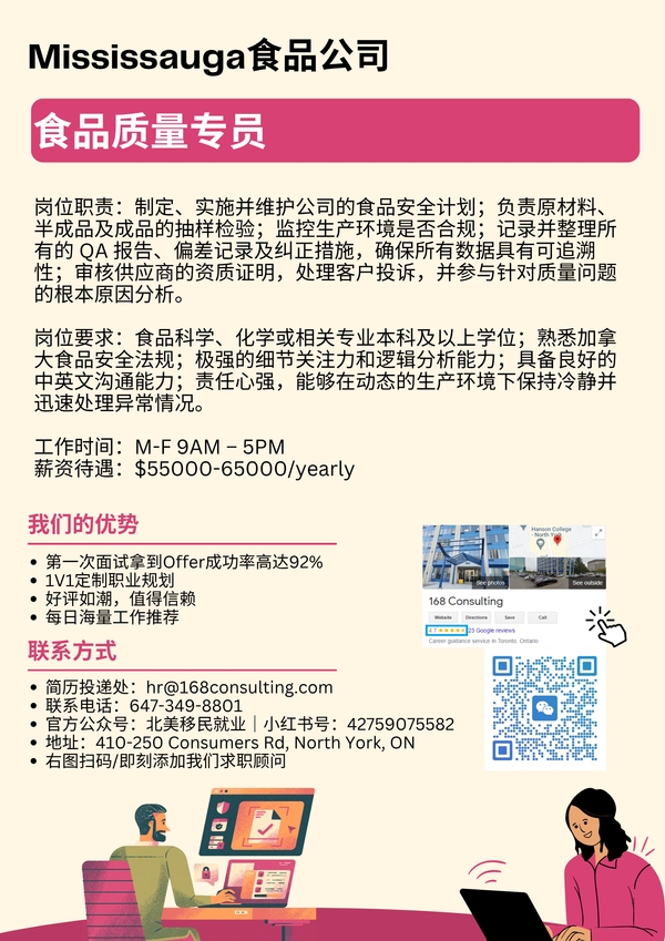 【168工作内推】Mississauga食品公司请食品质量专员1名