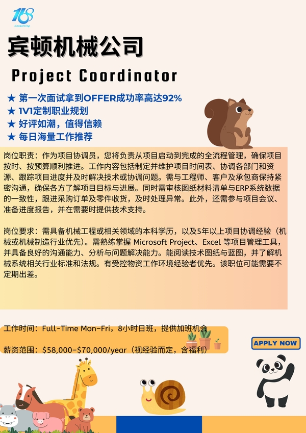 【168中介内推】宾顿机械公司请 Project Coordinator 1名