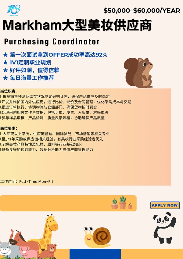 【168中介内推】Markham大型美妆供应商诚聘Purchasing Coordinator