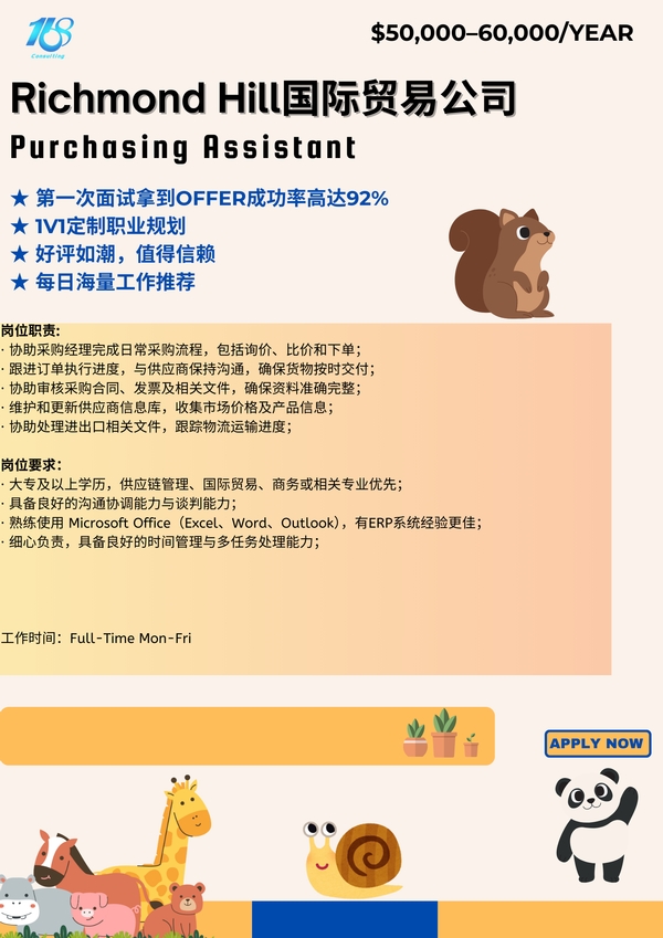 【168中介内推】Richmond Hill国际贸易公司诚聘Purchasing Assistant