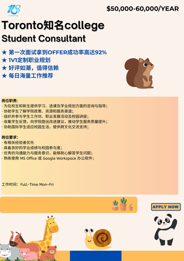 【168中介内推】Toronto知名college诚聘Student Consultant
