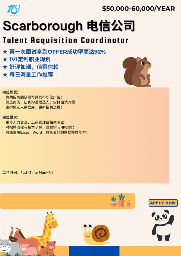 【168中介内推】Scarborough 电信公司诚聘Talent Acquisition Coordinator