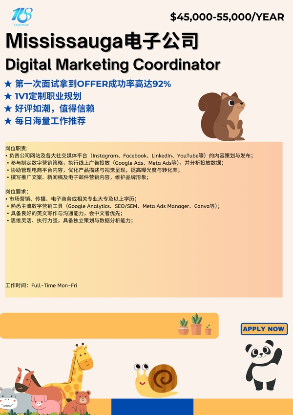 【168中介内推】Mississauga电子公司诚聘Digital Marketing Coordinator