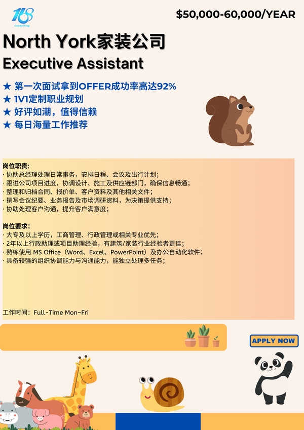 【168中介内推】North York家装公司诚聘Executive Assistant