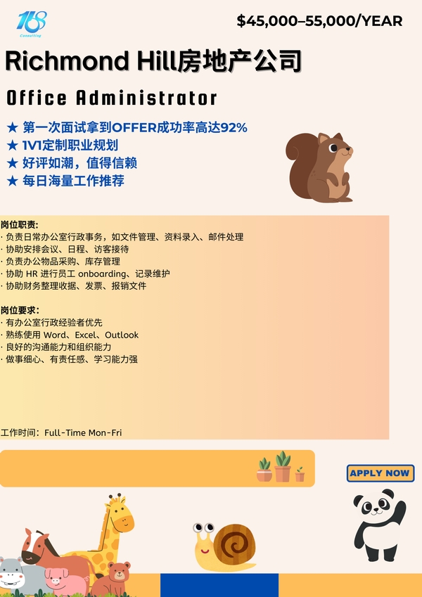【168中介内推】Richmond Hill房地产公司诚聘Office Administrator