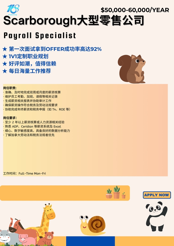 【168中介内推】Scarborough大型零售公司诚聘Payroll Specialist