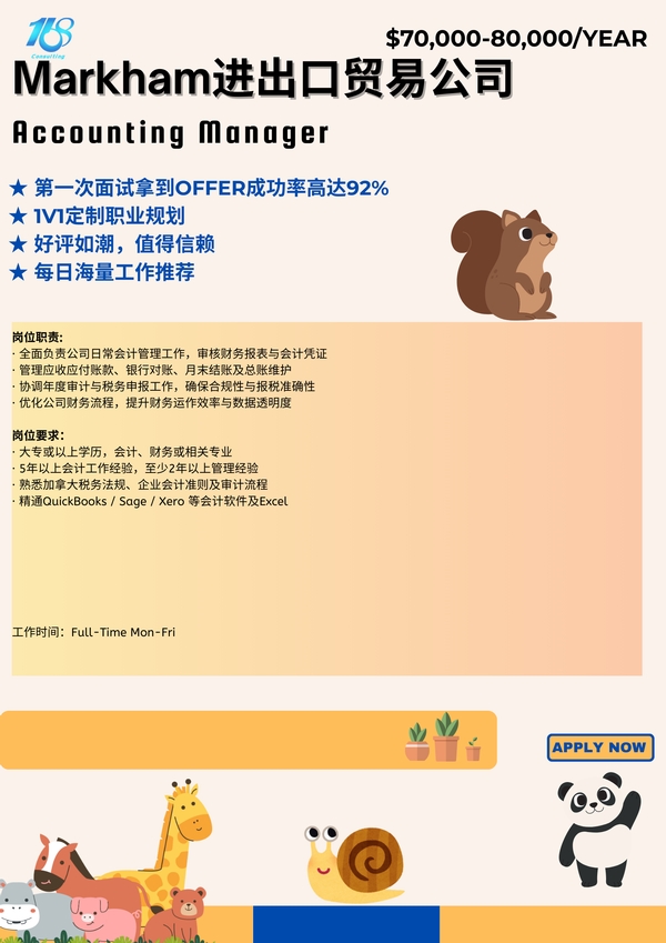 【168中介内推】Markham进出口贸易公司诚聘Accounting Manager