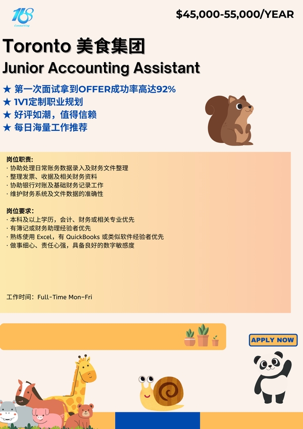 【168中介内推】Toronto 美食集团诚聘Junior Accounting Assistant