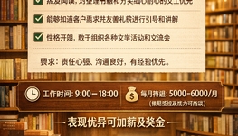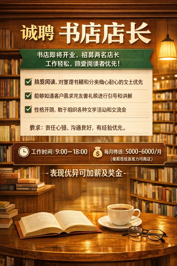 书店目前在最后筹备阶段,预计一个月时间开始运营,现招1名店长,2名店员,工作轻松,热爱阅读者优先!